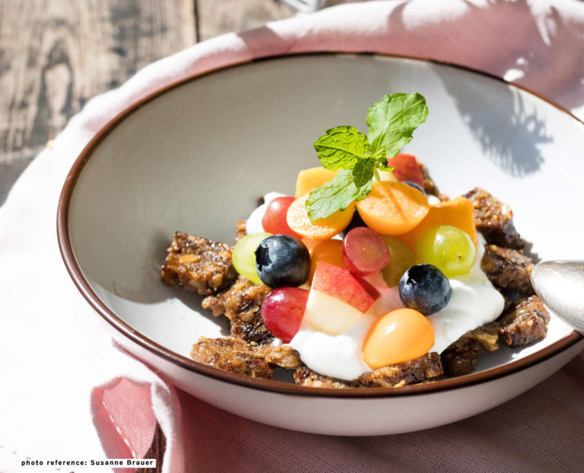 신선한 과일과 허니 커드를 곁들인 통호밀빵