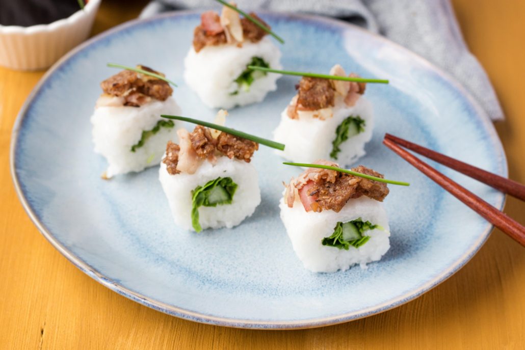 Herbed sushi with Westphalian Wholemeal Rye Bread-bacon topping