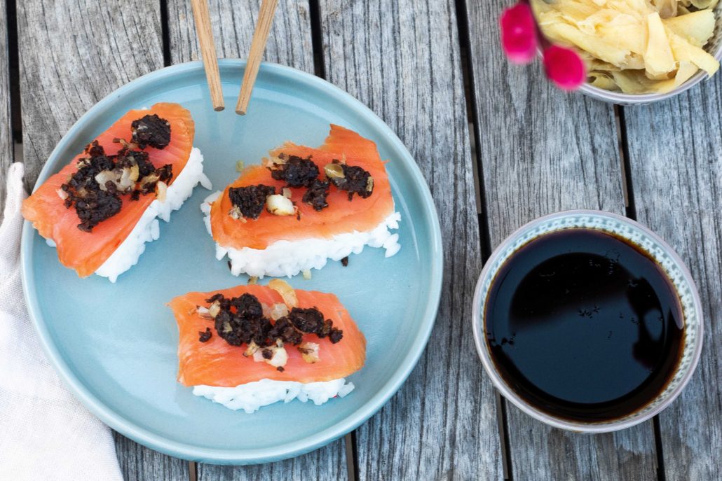 Nigiri sushi with salmon and Westphalian-Pumpernickel-onion topping