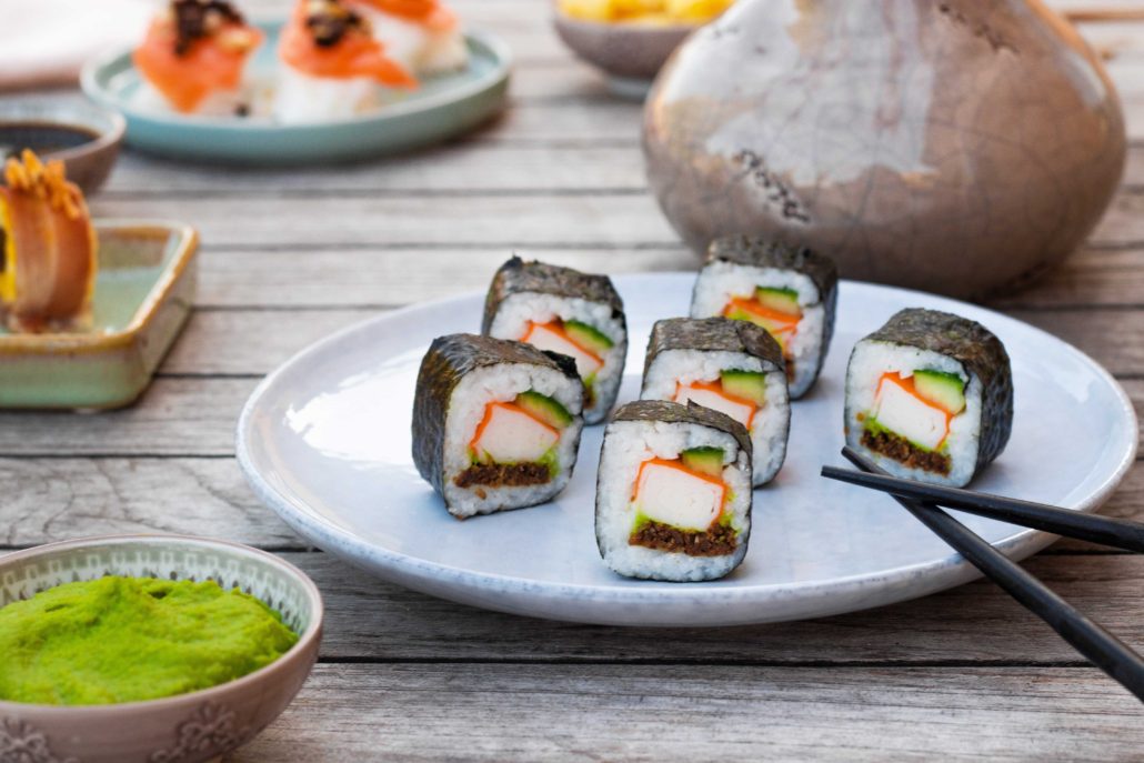 Sushi with surimi, wasabi and Westphalian Pumpernickel